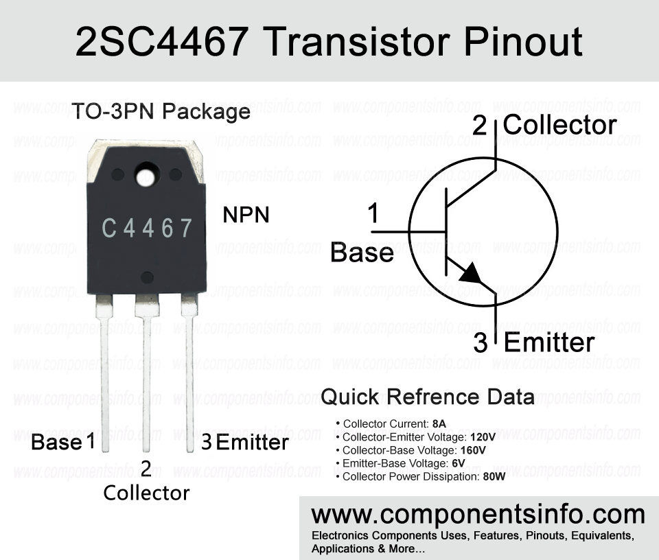 2SC4467 is an NPN transistor available in TO-3PN package. In this post we are going to discuss 2SC4467 transistor pinout, equivalent, uses, features and other useful information.