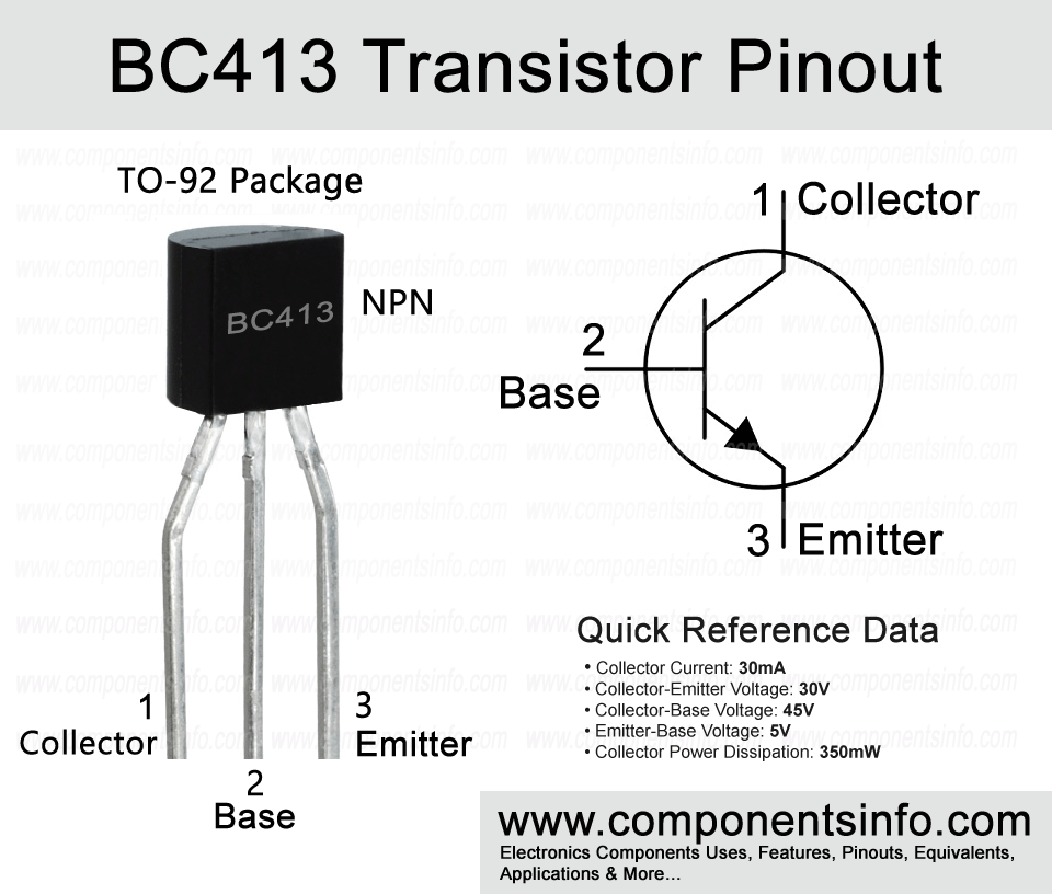BC413 is a TO-92 package NPN transistor designed to be used in general purpose applications. This post discusses on BC413 transistor pinout, equivalents, features, applications, advantages, disadvantages and more.